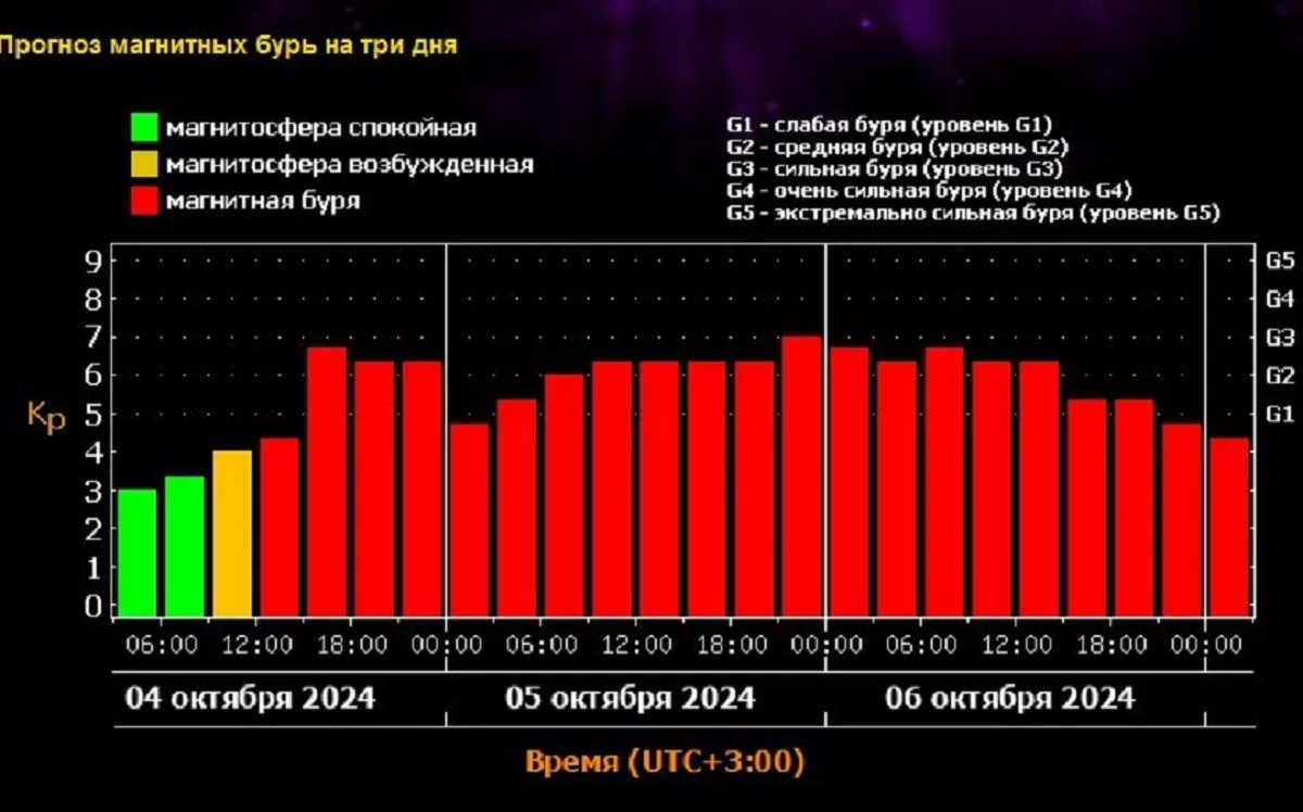 - При этом по-прежнему ожидается что они временами будут достигать уровня G3 - сильных магнитных бурь, и что более интересно, продлятся как минимум трое суток - по уточненным данным, учитывающим последнюю вспышку класса Х на Солнце, окончание магнитных бурь теперь ожидается только в начале понедельника, - сообщил ведущий синоптик центра погоды «Фобос» Михаил Леус в своем Telegram-канале.