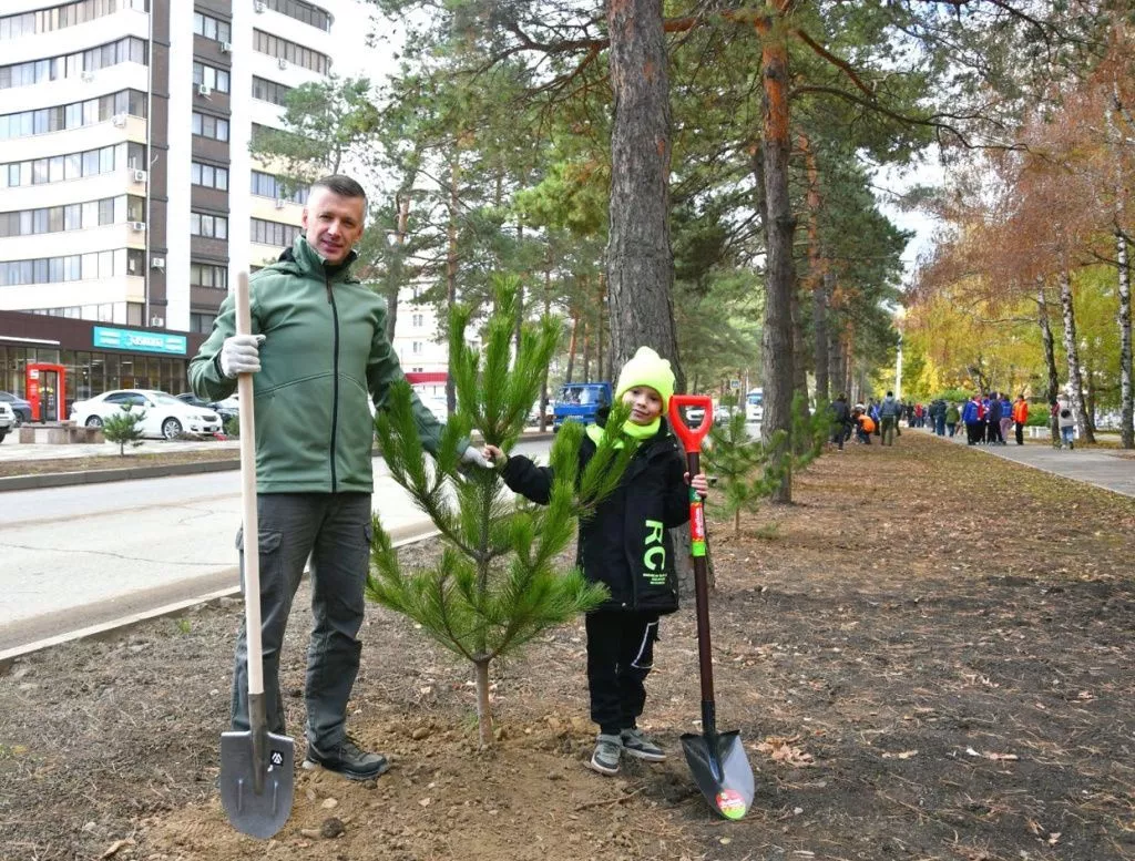 Десятки горожан собрались на центральной улице города рано утром. Многие пришли с детьми, как и первые создатели Аллеи тысячи сосен в 50-х годах прошлого столетия. Глава города Сергей Белопольский на высадку пришел с сыном.