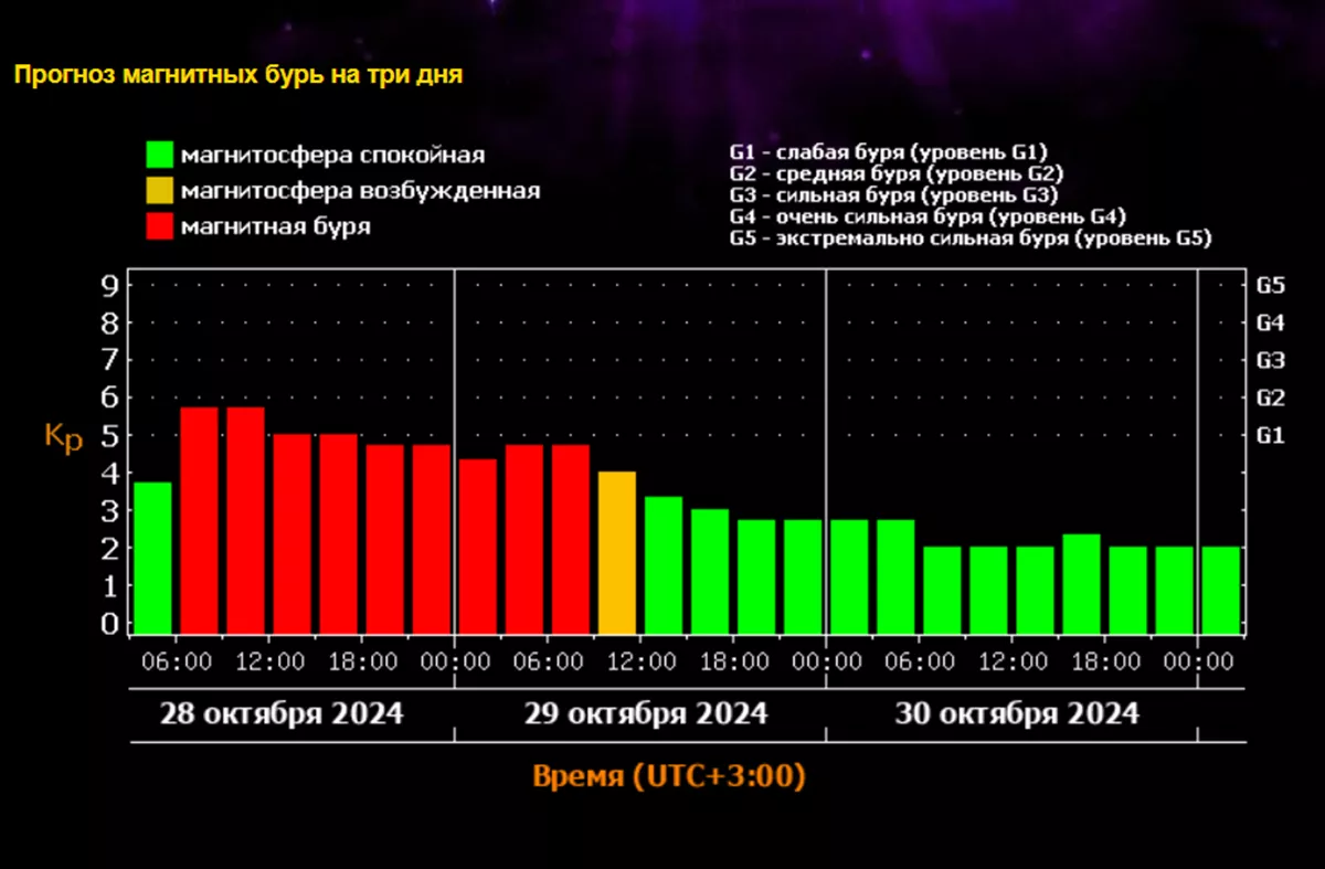Магнитная буря началась на Земле утром 28 октября. Как сообщил в своем телеграм-канале ведущий синоптик центра погоды «Фобос» Михаил Леус, около 9.00 индекс Кр, отражающий уровень возмущений геомагнитного поля, достиг отметки в 5 единиц, что соответствует слабой магнитной буре класса G1.