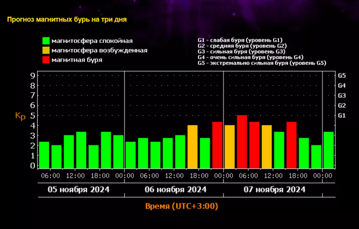 Магнитная буря может продлиться почти сутки – с вечера 6 ноября до вечера 7 ноября.