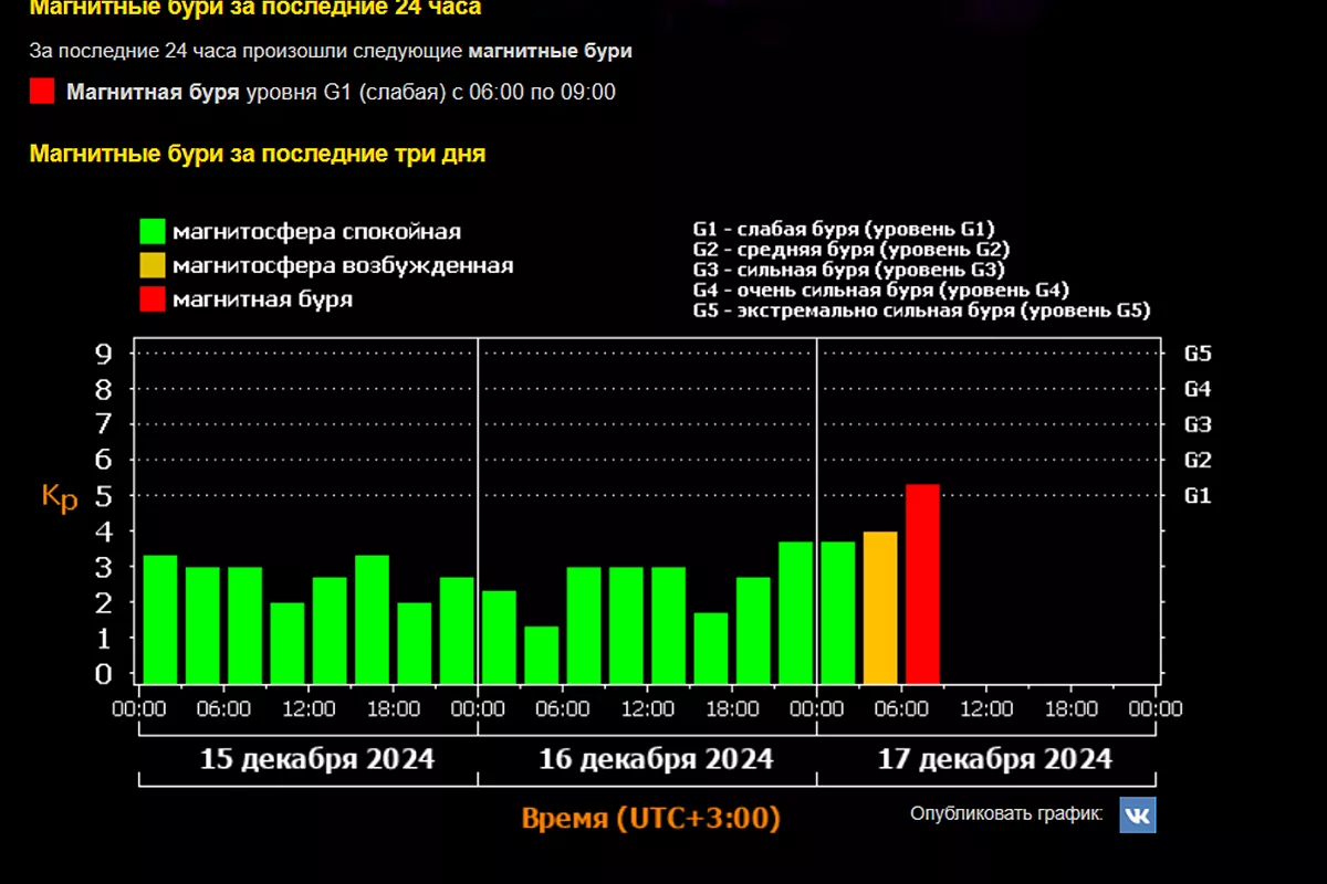 Причина магнитной бури – поток более плотного и быстрого, чем обычно, солнечного ветра. По данным прогностических центров, затяжной она не будет. До экстремальных значений также не дойдет.