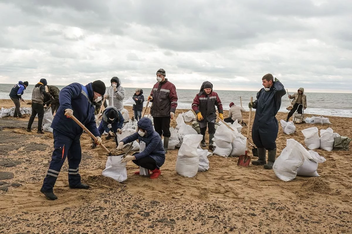 Кубанские спасатели – первые, кто оказался в зоне ЧС. Сотрудники аэромобильной группировки Южного регионального поисково-спасательного отряда (ЮРПСО) рассказывают: в первые же часы после получения от танкеров сигнала бедствия они выехали в Темрюкский район для проведения спасательной операции. А сразу после обнаружения мазута на пляжах Анапы приступили к работе уже здесь. Перекидывают лопатами, как и волонтеры, сотни килограммов песка. Собирают нефтепродукты сменами по 12 часов и не уедут домой, пока ситуация не стабилизируется.