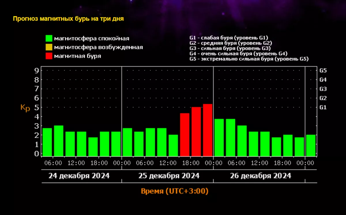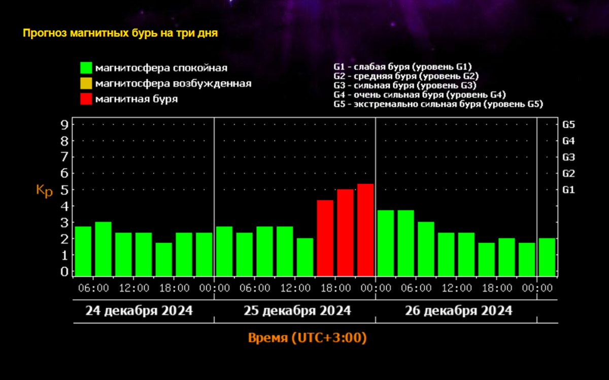 Магнитная буря уровня G1 может ударить по Земле 25 декабря. Продлится она около девяти часов. По прогнозу на сайте Лаборатории солнечной астрономии ИКИ и ИСЗФ, магнитосфера нашей планеты будет находиться в возбужденном состоянии с 15.00 и до полуночи.