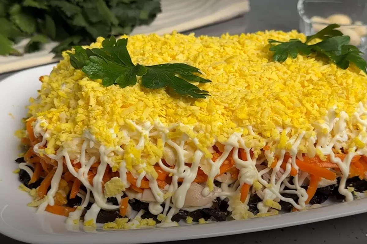 Куриное филе отваривается и нарезается, выкладывается вторым слоем. Грецкие орехи промываются и измельчаются. Морковь по-корейски добавляется к орехам и перемешивается. Морковь выкладывается третьим слоем на куриное филе. Сыр натирается на крупной терке, смешивается с чесноком и майонезом, после чего сырный слой выкладывается на морковь.