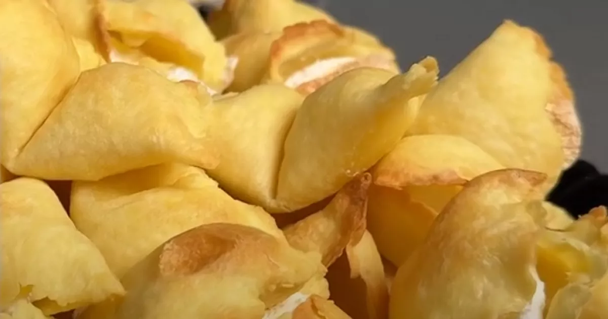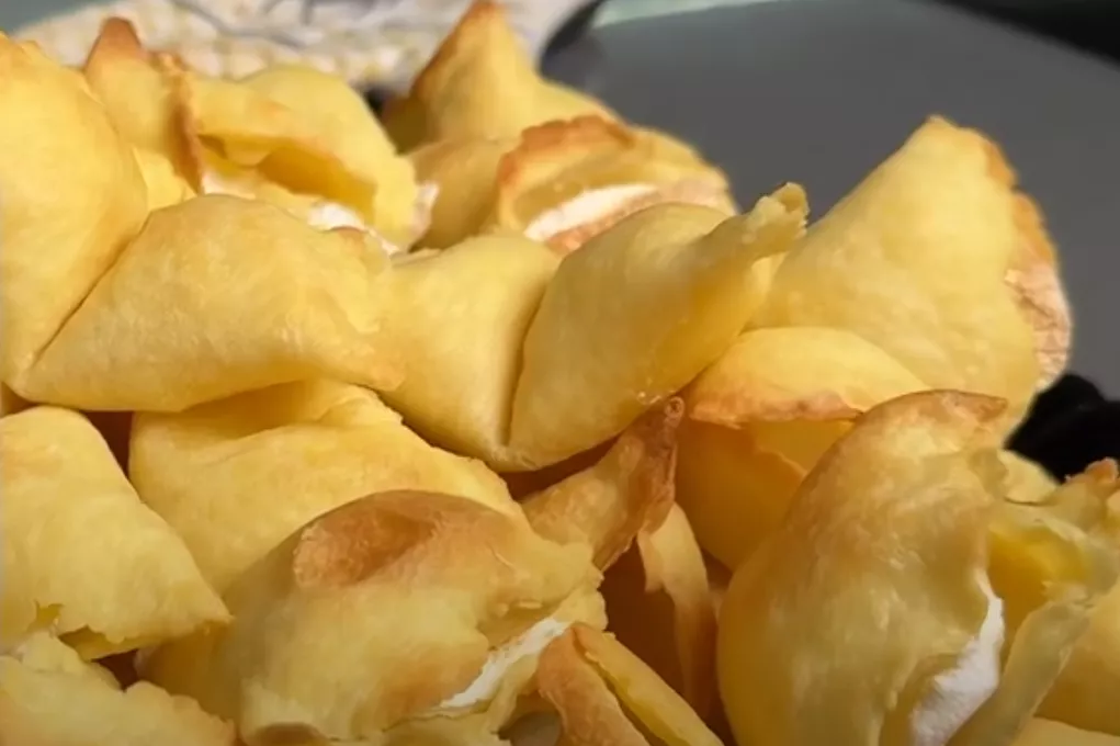 Приготовление начинки: белки взбиваются с щепоткой ванилина, сахаром и щепоткой лимонной кислотой до пышной массы миксером. Должна получиться тягучая белая масса, меренга. Тесто остыло, и начинаем формировать печенье. Заготовка раскатывается тонко скалкой, и меренга выкладывается на одну половинку, после чего тесто защипывается, как вареник. Палочкой или шпажкой по середине заготовки делается углубление, концы складываются друг к другу, наподобие крылышек. Печенье отправляется на противень с пергаментной бумагой и выпекается при 190 градусах 10-15 минут. Печенье воздушное, слоистое, нежное и сладкое.