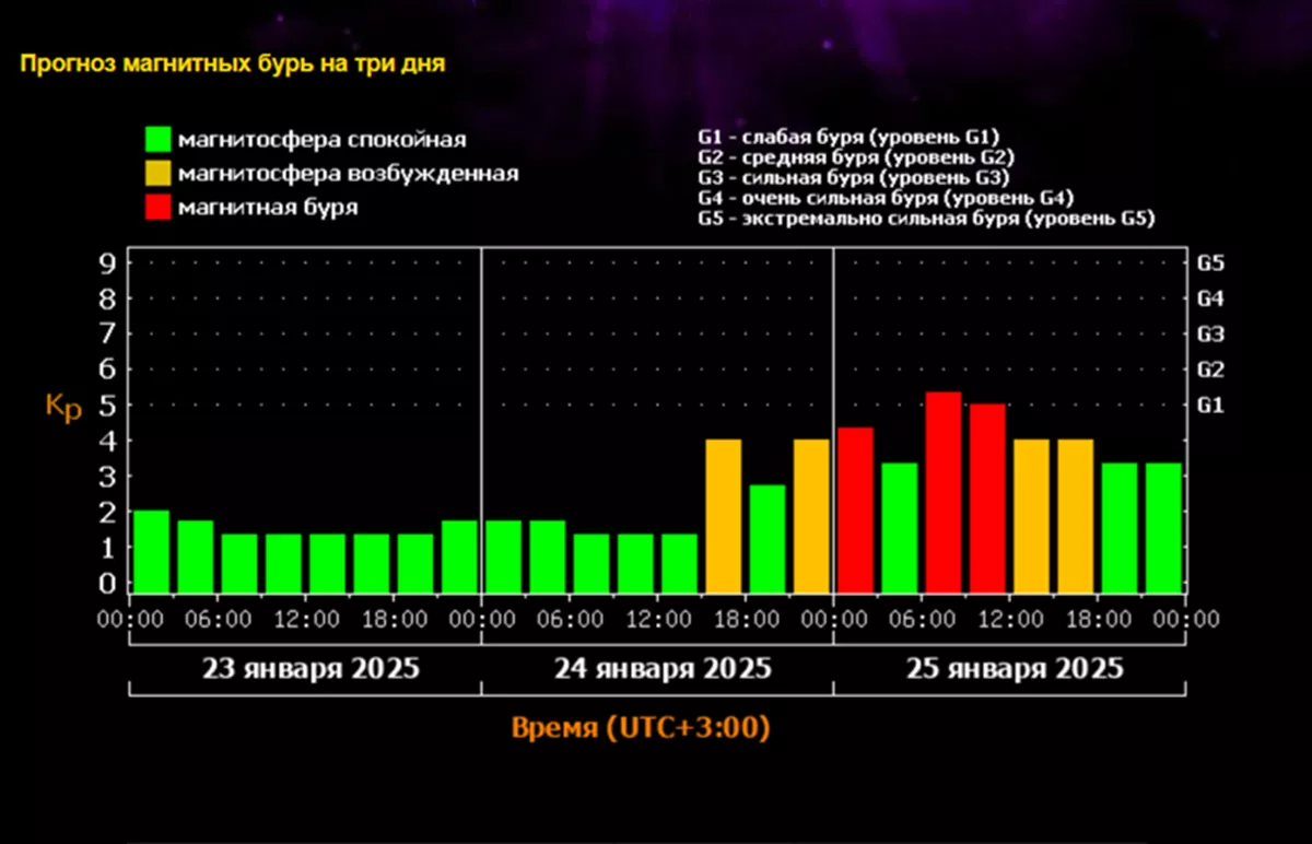 По прогнозу на сайте Лаборатории солнечной астрономии ИКИ и ИСЗФ, геомагнитное поле перейдет в возмущенное состояние около 15.00 24 января. Настоящая буря ударит сразу после полуночи. До уровня G2 она разыграется к утру. Пик придется с 6.00 до 9.00. После этого она пойдет на убыль и вечером прекратится.