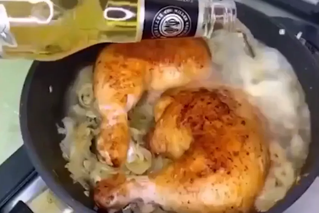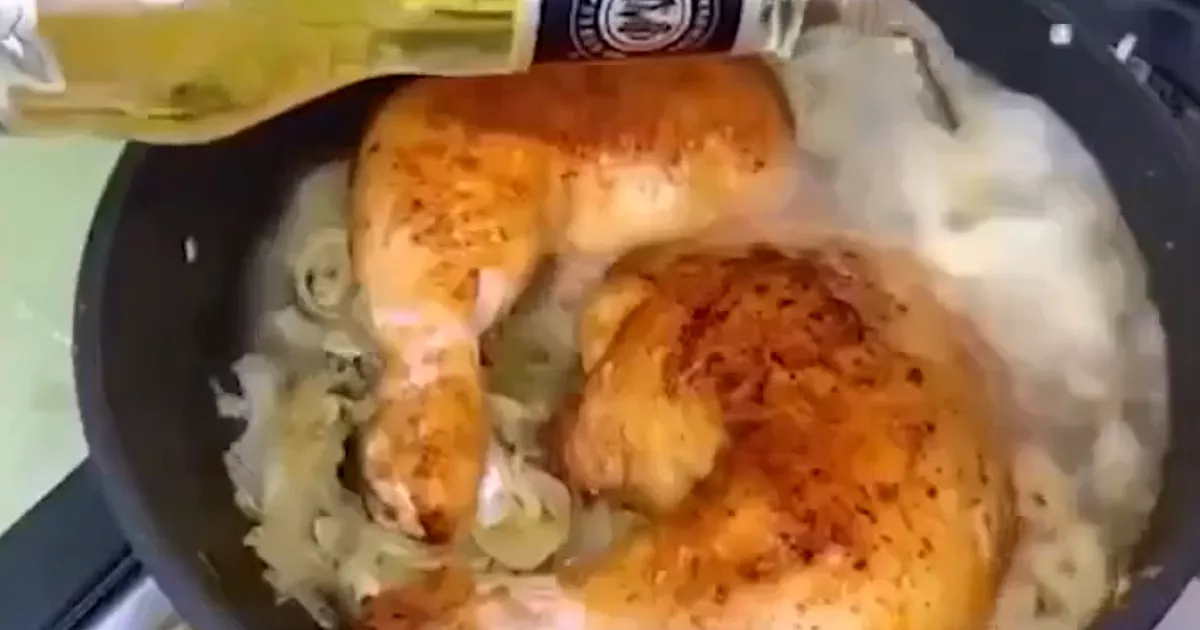 Итак, берем два простых куриных окорочка, посыпаем их сладкой паприкой, солью по вкусу. Бросаем их на раскаленную сковородку с растительным маслом, обжариваем с двух сторон до золотистой корочки. Достаем обжаренные окорочка и отправляем в то же масло, где они жарились, пару луковиц, нарезанных полукольцами. Обжариваем их немного. Сверху кладем окорочка, выливаем 300 мл пива и томим 30 минут под крышкой. Получаем ароматную курочку, которая просто тает во рту.
