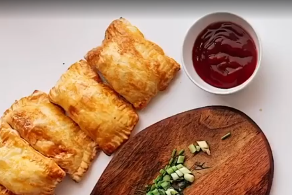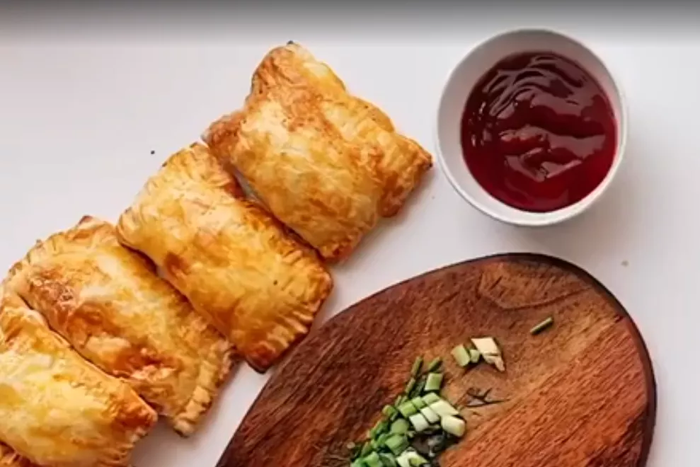 Итак, легко нарезаем кубиками ветчину, сыр для начинки натираем, чтобы лучше плавился. Берем в магазине готовое слоеное тесто, размораживаем и раскатываем в тонкий пласт. Разделяем на порционные части, и на каждую из них кладем нашу начинку, формируем слойки, защипываем кончики. Их можно придавить вилочкой, и получатся симпатичные узоры.