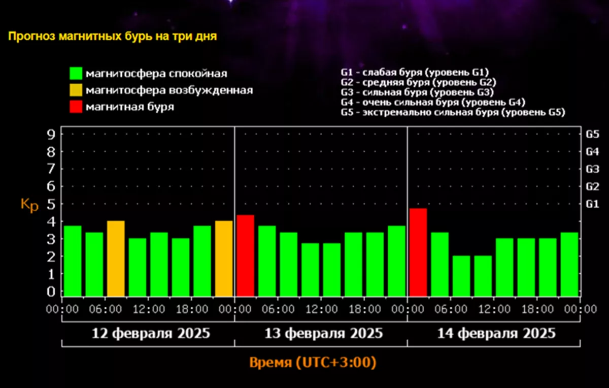 Магнитная буря уровня G1 может ударить по Земле и 13 февраля. Продлится она не более трех часов. По прогнозу на сайте Лаборатории солнечной астрономии ИКИ и ИСЗФ РАН, магнитосфера нашей планеты будет находиться в возбужденном состоянии сразу после полуночи.