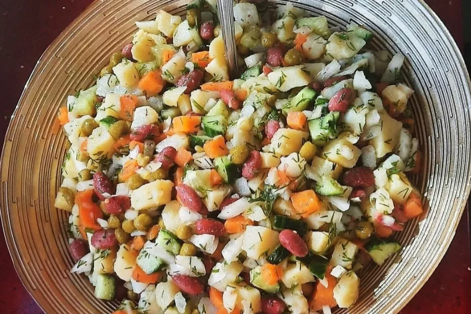 Ингредиенты: - 4 картошки; - 2 моркови; - 1 луковица; - 1/2 стакана фасоли, консервированной или отварной; - 1/2 стакана зеленого горошка; - 1 огурец; - пучок укропа; - 4-5 ст. л. растительного масла (можно ароматное использовать); - специи по вкусу.