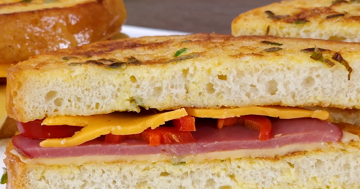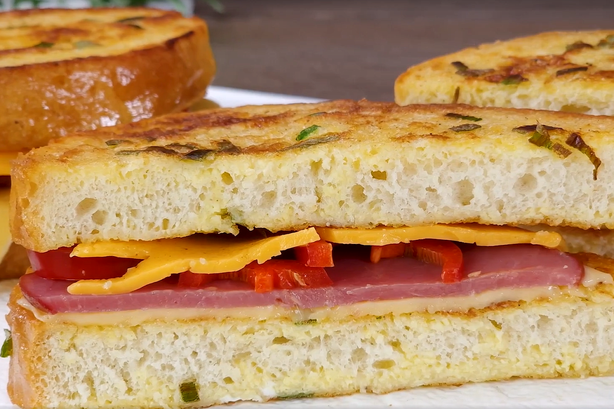 Обмакиваем в яйцо кусочки хлеба и выкладываем их на сковородку. Обжариваем с двух сторон до корочки и достаем из сковородки. Сверху на одну гренку выкладываем кусочки мягкого сыра (как для бургера), мясо или колбасу, колечки сладкого перца, еще ломтик мягкого сыра и накрываем сверху второй гренкой. Разрезаем бутерброд, типа сэндвича, и можно есть. Быстро и очень вкусно!