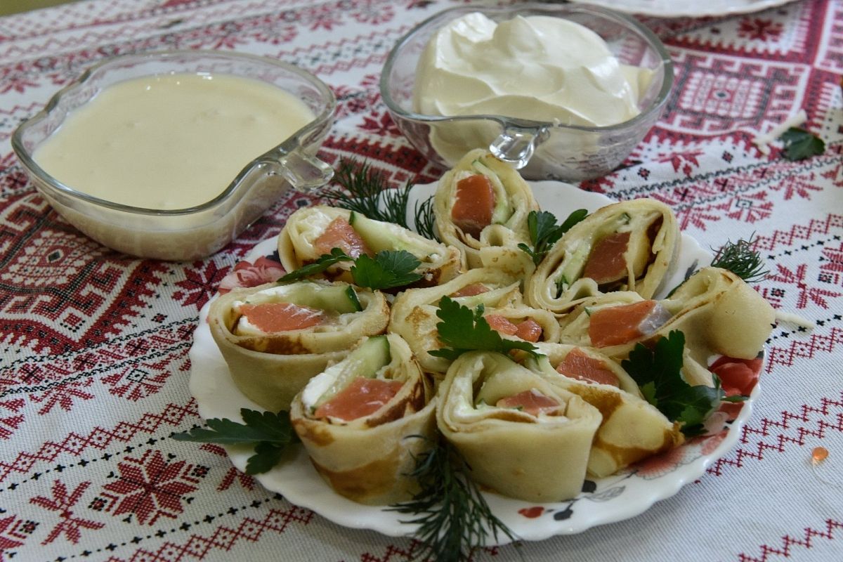 – Основной момент в технологии приготовления теста: яйца взбиваются и заливаются тоненькой струйкой кипятка, что дает пышность. И молоко обязательно должно быть свежее. Кроме сахара, соли и муки в тесто добавляется топленое сливочное масло. Это придает блинам особую нежность. Если нужны просто блины, выпекаю их потоньше, с дырочками, а если для начинки – немного плотнее делаю, – говорит шеф-повар.