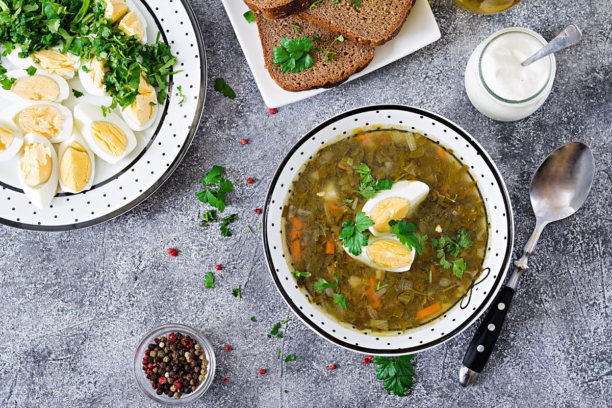 Когда сварится картошка в бульоне, выкладываем заправку в кастрюлю. Перемешайте все и пусть бульон кипит на слабом огне еще 3 минуты. Затем кладите мелко нарезанный щавель и лавровый лист. После закипания посолите и поперчите борщ по своему вкусу. Пусть он покипит еще пару минут и выключайте плиту. Накройте борщ крышкой и пусть он настоится 10-15 минут перед тем, как его подадите на стол.