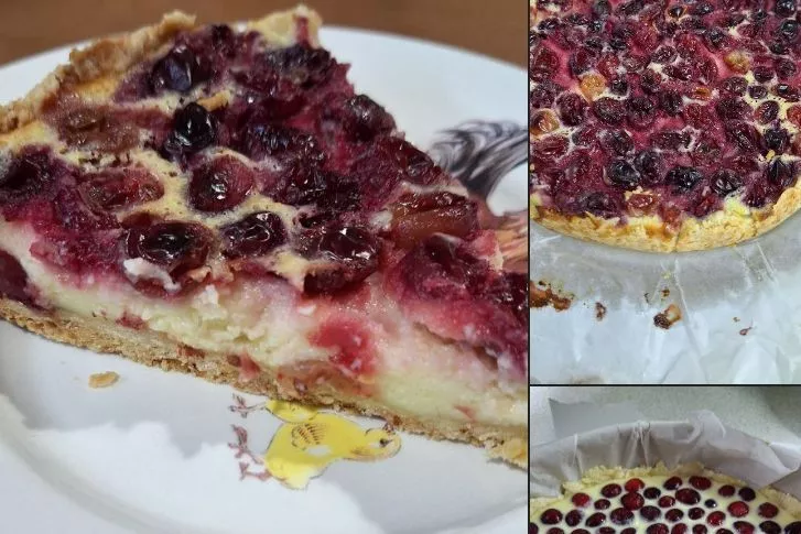 Вылейте на основу начинку. Сверху выложите ягоды клюквы. Выпекайте пирог в предварительно разогретой до t=180℃ духовке 40-45 минут. Готовый пирог оставьте в выключенной духовке еще на 10-15 минут.