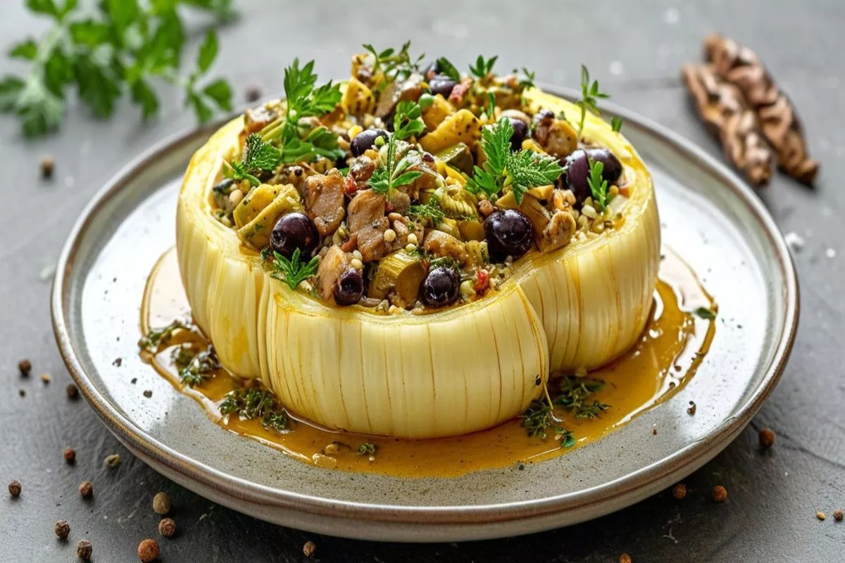 Кочаны фенхеля достаем из кастрюли, воду сливаем и даем стечь, разрезаем их пополам. Удаляем сердцевину, измельчаем вместе с томатами и оливками. Получается оригинальная подлива. Ею поливаем блюдо с половинками фенхеля, фаршированными яйцом и анчоусами.