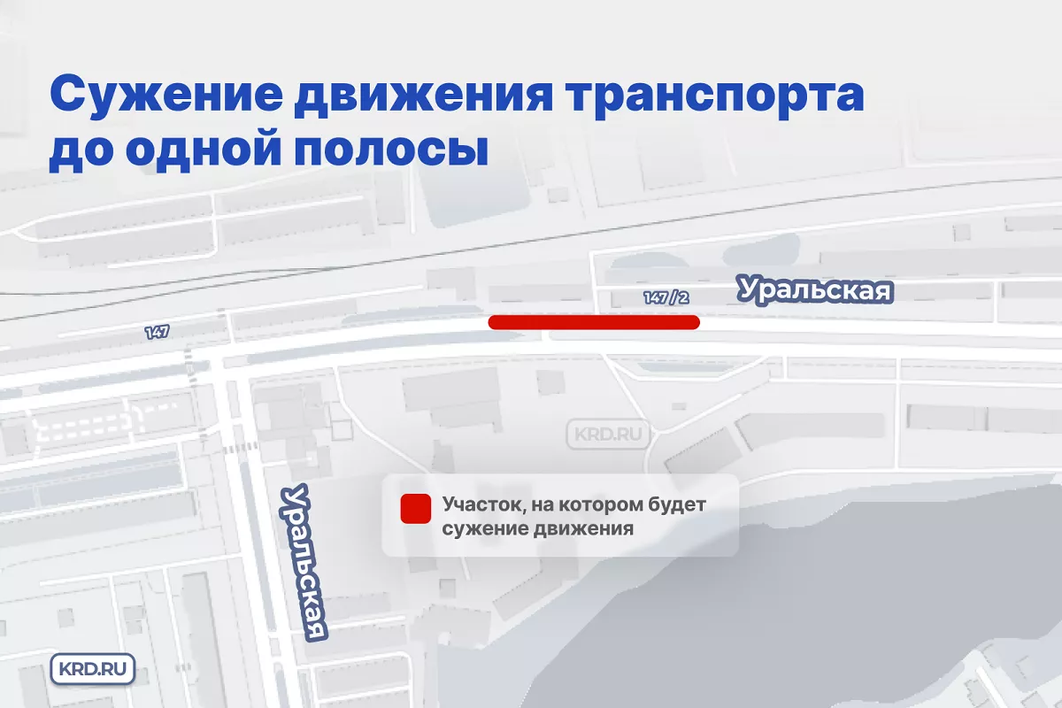 Отмечается, что из-за строительства пешеходного перехода планируется двухэтапное ограничение движения транспорта по ул. Уральской в районе дома № 147/1 с сужением до одной полосы проезжей части в сторону въезда в город.