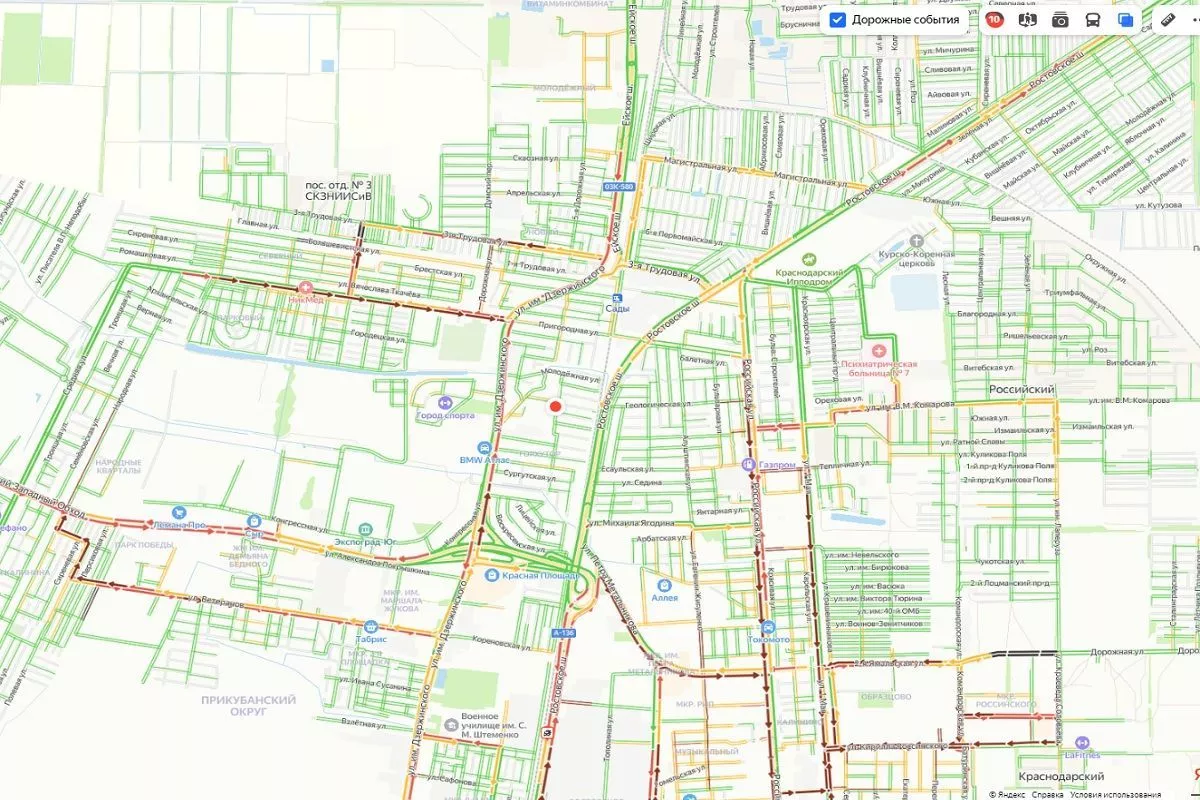 Стоит центр города – улицы Красная, Коммунаров, Гаврилова, Одесская, Октябрьская, Рашпилевская, Калинина и Буденного. Заторы на улице Северной, Промышленной, Костылева, Янковского и других близлежащих. Плотное движение наблюдается на Филатова,Восточно-Кругликовской, Российской и 1-го Мая. Загружены Западный и Ближний Западный обходы Краснодара.