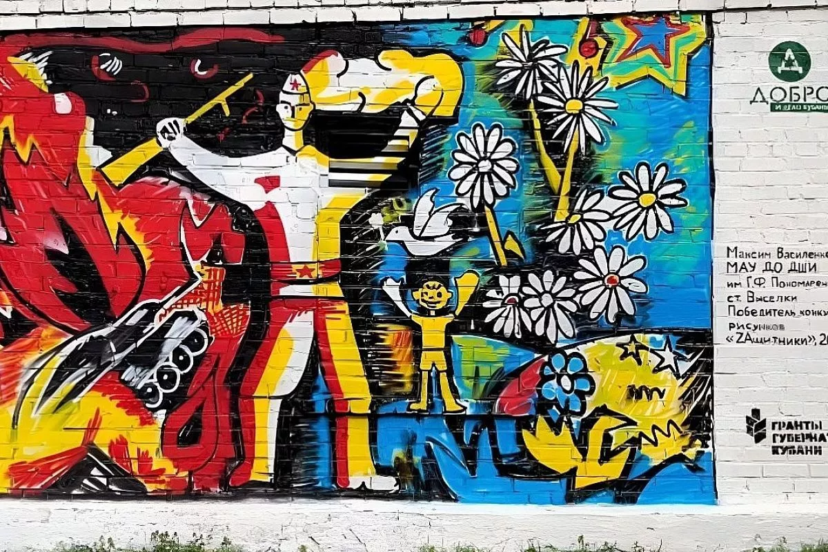 Мурал по эскизу школьника Максима Василенко создали в центре Краснодара. Ученик седьмого класса Детской школы искусств им. Пономаренко станицы Выселки стал победителем конкурса «Zащитники: сила, честь и отвага России», который организовал фонд «Добро и дело» при поддержке Гранта губернатора Кубани.