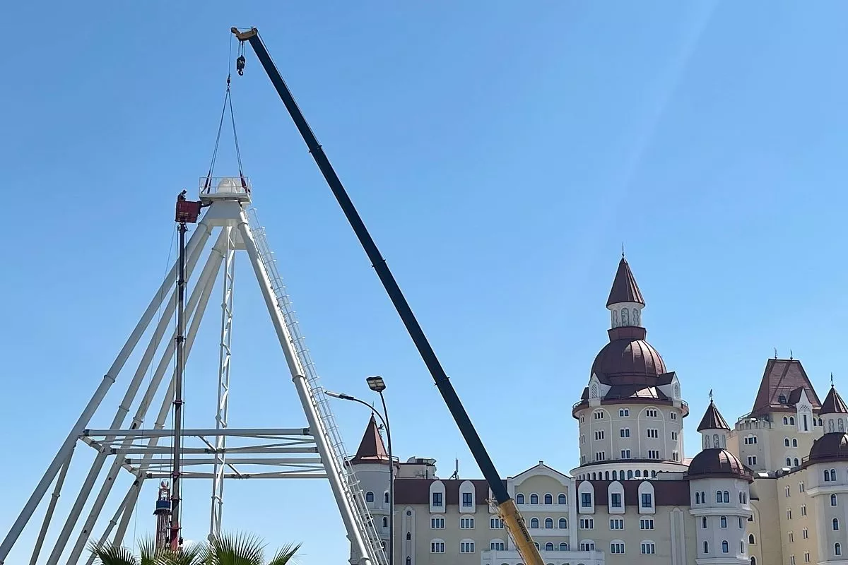 Монтаж конструкции обзорного аттракциона начался в марте. В настоящий момент завершилась установка опор центральной оси и начинается монтаж подвижной части аттракциона.