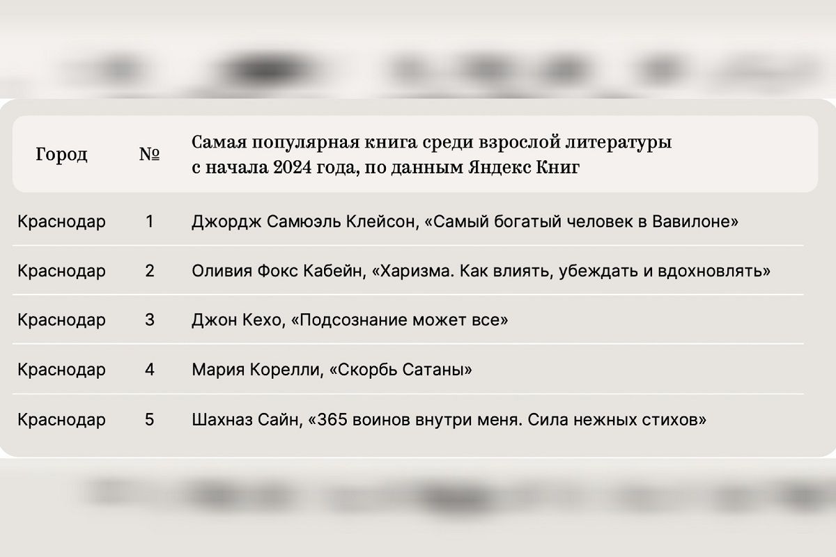 По данным Яндекс Книг, жители Краснодара чаще других читают или слушают книгу о финансовой грамотности, а именно «Самый богатый человек в Вавилоне».