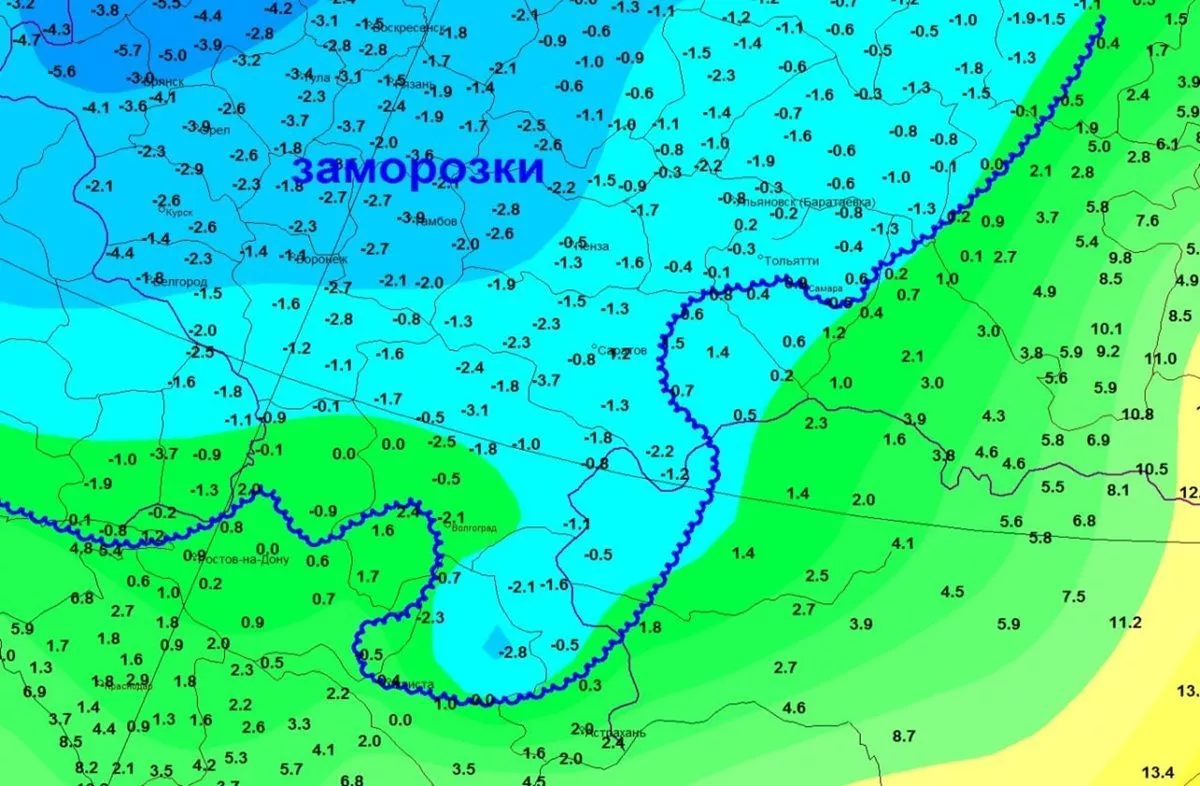 - Зона заморозков на территории Европейской России занимает все новые и новые территории. Если в субботу территория, занятая отрицательными температурами, ограничивалась центральными районам ЦФО, то вчера она опустилась к северным границам Южного округа, а сегодня проникла еще дальше, - написал в своем телеграм-канале ведущий синоптик центра погоды «Фобос» Михаил Леус. - Минувшей ночью заморозки добрались уже до южных районов Ростовской области, а также наблюдались в Калмыкии и Астраханской области.