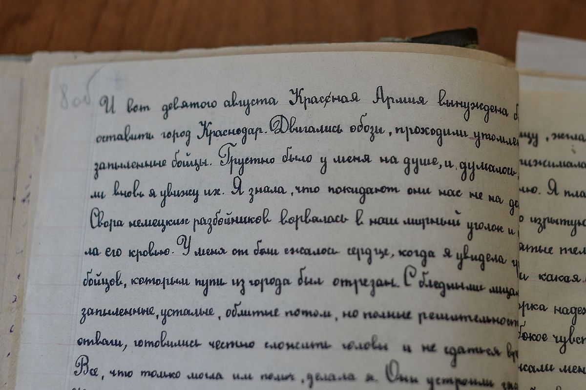 «В этот день вступили в наш город ненавистные немцы. Это были не такие люди, как другие, – это были кровожадные звери с хищными глазами, которые так и искали, чего бы сотворить ужасного. Они начали с первого дня расправляться с жителями. Фашисты ходили толпами по дворам, рылись в квартирах и забирали ценные вещи. Они издали приказ о прекращении хождения после шести часов вечера. И если какой-нибудь несчастный показывался после указанного времени, они бесчеловечно его расстреливали. Каждый немец мог что угодно сделать с любым человеком. Они хватали невинных людей и бросали в застенки гестапо, там их пытали ужасными машинами, сажали в машины-душегубки и везли за город… Нам нечего было кушать, и моя мама под страхом смерти вынуждена была идти в станицу добывать хлеб. Я оставалась дома с младшим братом, все время испытывая страх за маму и за себя».