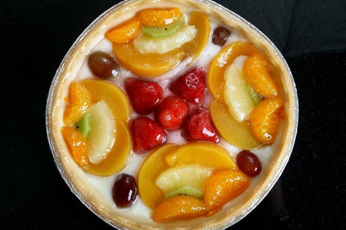 Достаньте тесто из холодильника и раскатайте на присыпанной мукой поверхности в круг диаметром немного больше, чем форма для выпечки. Уложите его в форму. Удалите излишки теста по краям. Засыпьте форуму сухой фасолью и ставьте в разогретую духовку, чтобы основа подрумянилась. Через 20 минут доставайте, убирайте фасоль и дайте песочной форме чуть остыть. Затем наполните ее кремом с кусочками фруктов и снова отправляйте в духовку на 25 минут. Когда крем подрумянится, пироги с фруктами готовы. Приятного чаепития.