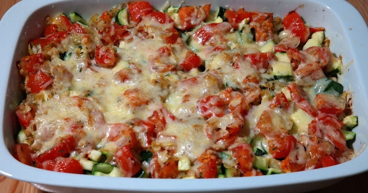Форму для запекания смазать сливочным или растительным маслом, выложить кабачковую массу, а сверху красиво разложить помидоры. Присыпьте все оставшимся тертым сыром и отправляйте запекаться в разогретую до 180 градусов духовку.
