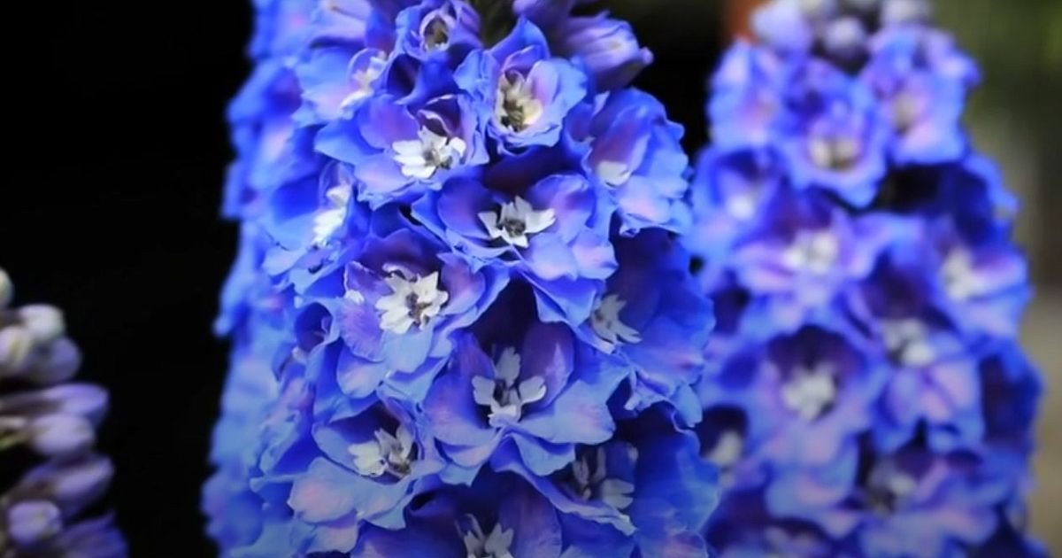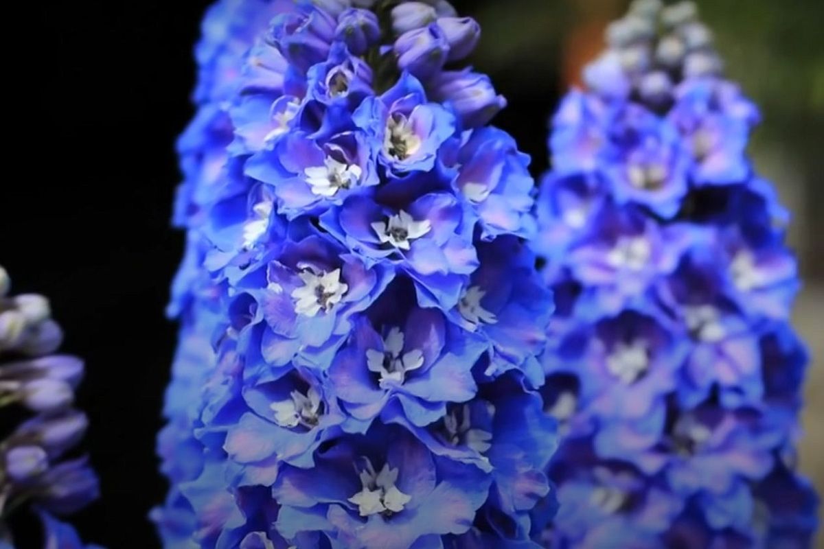 Дельфиниум (2–2,5 м) — Синие, белые или фиолетовые свечи соцветий (июнь-июль). Любит солнце и плодородную почву.