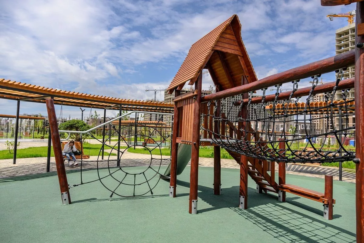Прогулявшись по всему «Флагманскому», мы оценили обустроенные аллеи, качество современного спортивного поля для футбола, баскетбола, волейбола и дорожки со специальным покрытием для бегунов и велосипедистов, восхитились наличием площадки для выгула собак и множеством детских игровых экогородков.