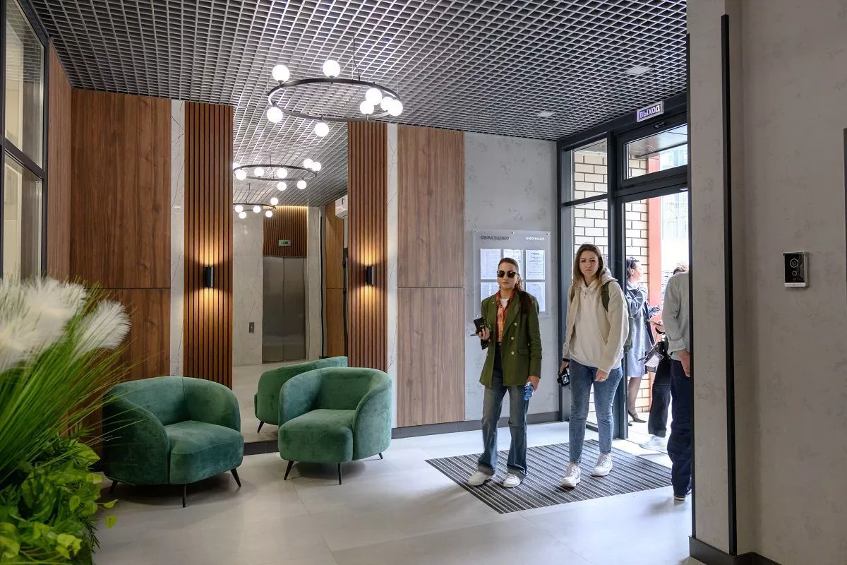 Приятно удивили журналистов дизайнерский подход к оформлению подъездов и входных групп, наличие трех лифтов и колясочной в каждом подъезде.