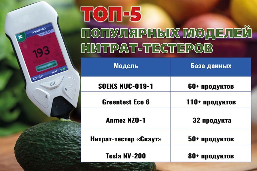 Прибор должен учитывать тип продукта, у него для этого есть встроенная база данных. Хороший тестер содержит нормы ПДК (предельно допустимые концентрации) для разных овощей и фруктов. В более продвинутых моделях есть возможность обновления через приложение.