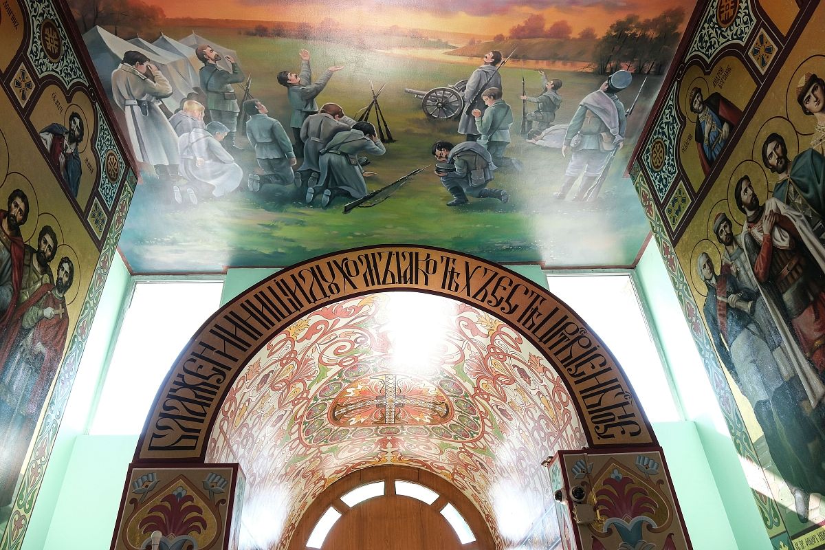 На другой стене можно увидеть Георгия Победоносца, Нестора Солунского, Никиту Бесогона и других святых. А на потолке храма расположился сюжет Августовской иконы Божией Матери. Она была написана в память явления Богородицы нашим бойцам во время Первой мировой войны в районе польского города Августов.