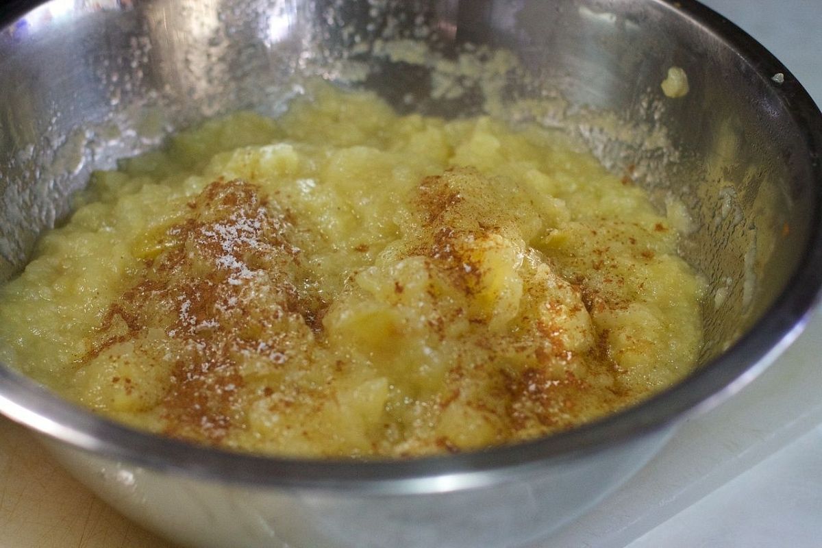 Спустя положенное время добавьте в яблоки сахар, перемешайте. Дайте яблокам еще раз закипеть и снимайте с плиты. С помощью блендера измельчите яблоки до состояния пюре. Если получается слишком густая масса, добавьте еще 30 мл кипяченной воды. Посыпьте пюре корицей и снова перемешайте.