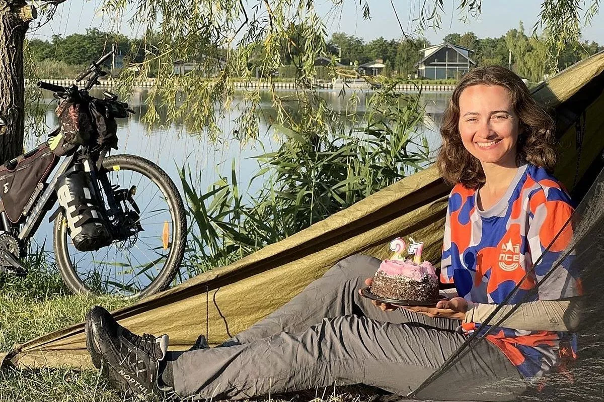 Москвичка Анна Роднищева уже почти месяц крутит педали – 9 июня она отправилась в очередное велопутешествие. В июле девушка добралась до Краснодарского края, где встретила свой 27-й день рождения. Девушка задула свечи на маленьком тортике, сидя на берегу реки в станице Каневской. Поздравления от родственников и друзей принимала по телефону.