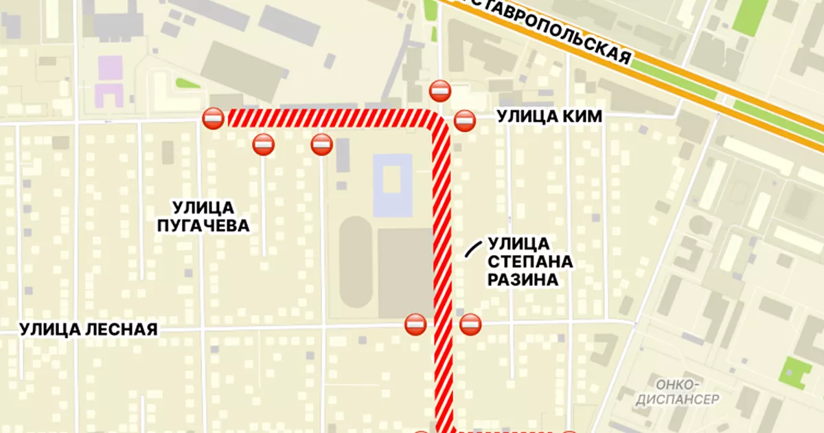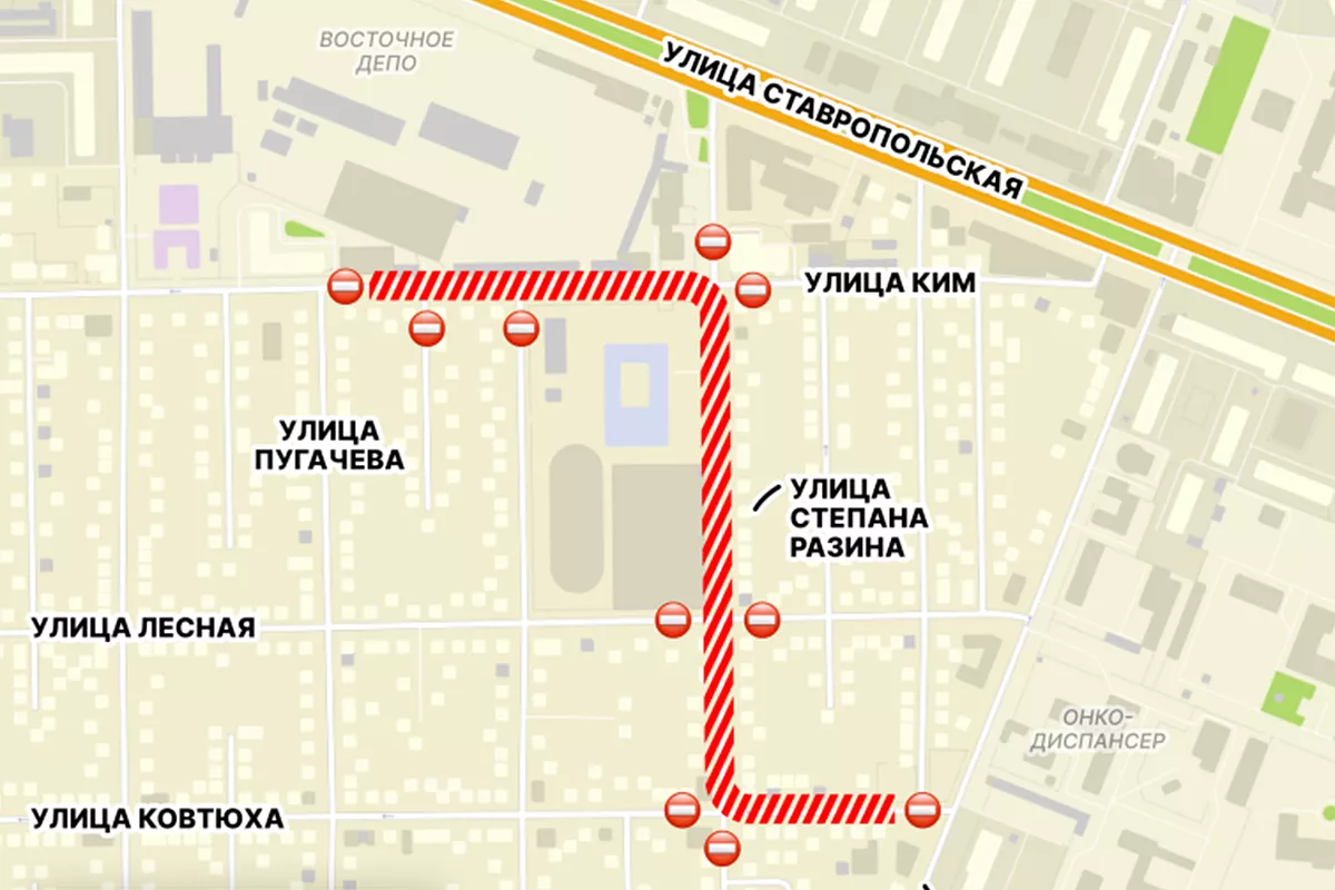 Уточняется, что на три месяца будет ограничено движение автомобильного транспорта по ул. им. Ковтюха - от ул. им. Димитрова до ул. им. Степана Разина, по ул. им. Степана Разина - от ул. им. Ковтюха до ул. КИМ; по ул. КИМ - от ул. им. Степана Разина до ул. им. Пугачева.
