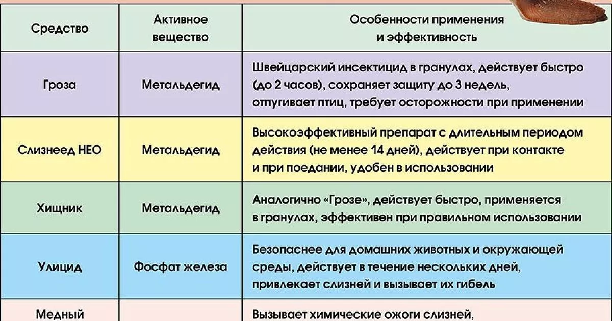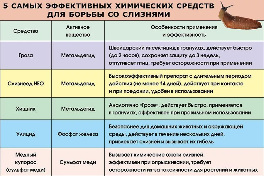 Среди химикатов наиболее эффективными считаются препараты на основе действующего вещества метальдегид («Гроза», «Слизнеед НЕО», «Хищник»), но их применение требует осторожности из-за определенного уровня токсичности.