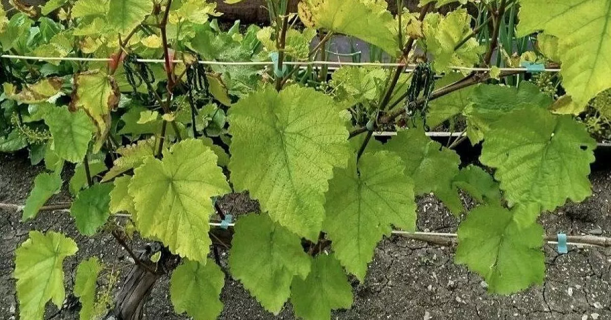 Пожелтение верхних листьев, появление коричневых пятен, а далее побледнение и усыхание зеленой массы и дальнейшая гибель куста – скорее всего, виноград поражен милдью (ложной мучнистой росой).