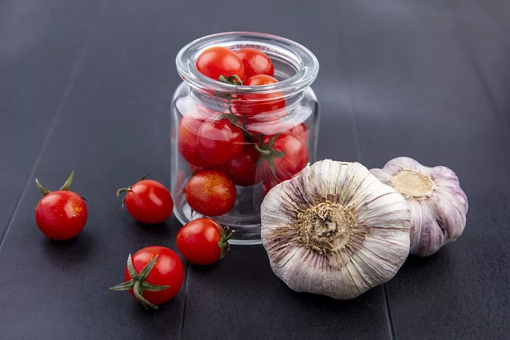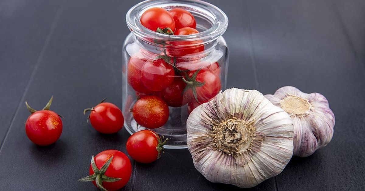На дно — чеснок, затем слоями: помидоры дольками → лук кольцами → зелень. Повторить.