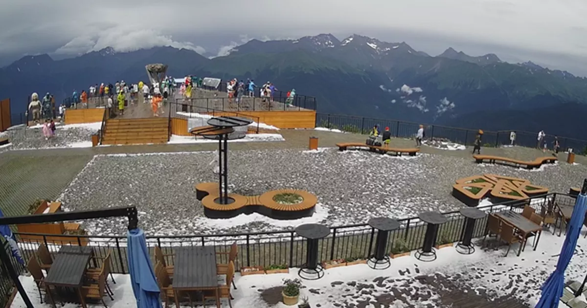 Необычными для экватора лета кадрами со смотровой площадки на отметке в 2320 метров поделились местные паблики. Попал снег и в объектив видеокамер, ведущих трансляцию в онлайн-режиме на одном из курортов в горном кластере. Он уже почти растаял.