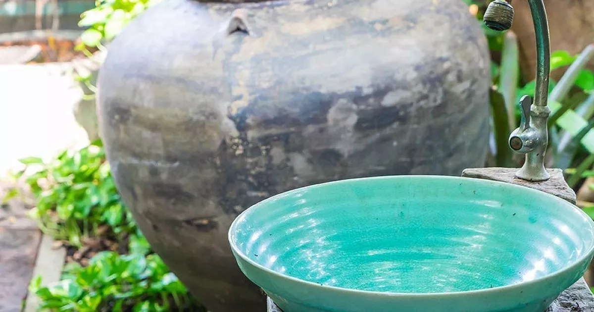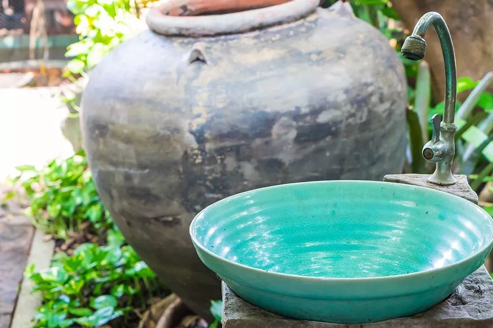 Наполните водой до краев: прикройте горлышко камнем или керамической крышкой (защита от комаров и мусора). Доливайте воду раз в 7–10 дней (в +35°C — раз в 5 дней).