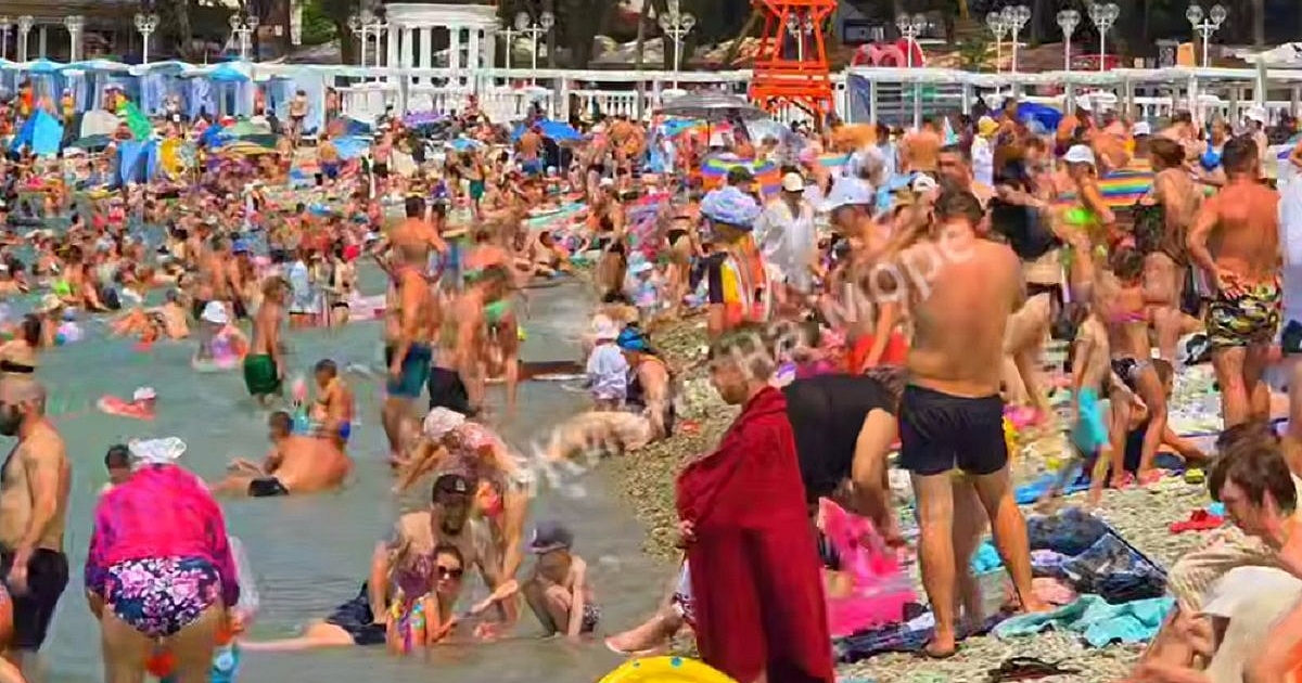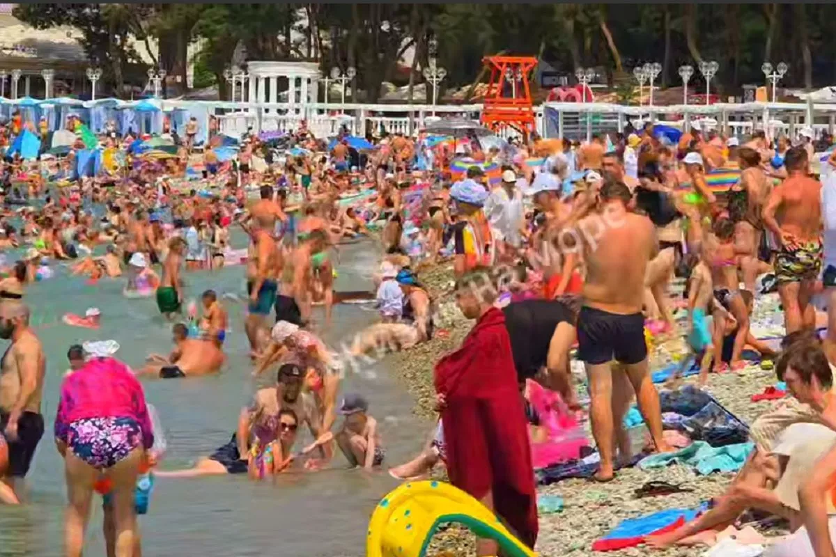 В субботу центральный пляж поселка Дивноморского забит отдыхающими. Видео с побережья опубликовали в местном Telegram-канале.