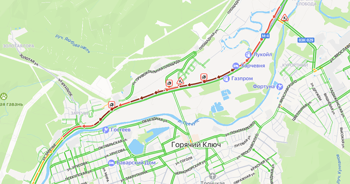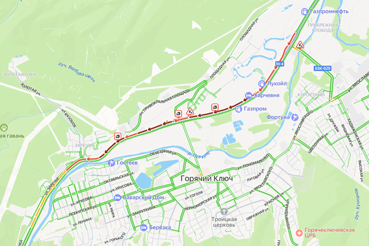 По данным «Яндекс. Карты», пробка появилась на трассе М-4 «Дон» у Горячего Ключа. Машины стоят от пересечения с улицей Промышленной до скалы Петушок. Есть затруднения и в районе Хребтового.