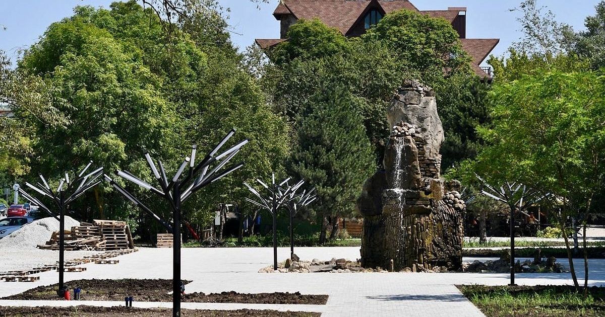 Он уточнил, что общая площадь благоустройства составляет свыше трех тысяч квадратных метров. Уже заменены коммуникации и тротуарная плитка, сделано новое ограждение из габионов, установлены декоративные светильники в форме деревьев, видеонаблюдение. После длительной остановки отремонтирован и запущен фонтан. Скоро будут установлены лавочки, запланировано также масштабное озеленение – его проведут осенью.