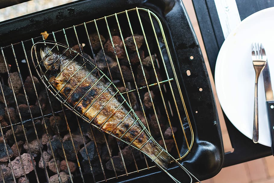 Для приготовления на углях лучше всего использовать не жирную морскую рыбу с плотным мясом и небольшим количеством костей. К таким видам относятся семга, тунец, скумбрия, морской окунь и кета. Из форели можно приготовить стейк, а из осетра — шашлык. Камбалу, дорадо и речную форель можно готовить целиком.