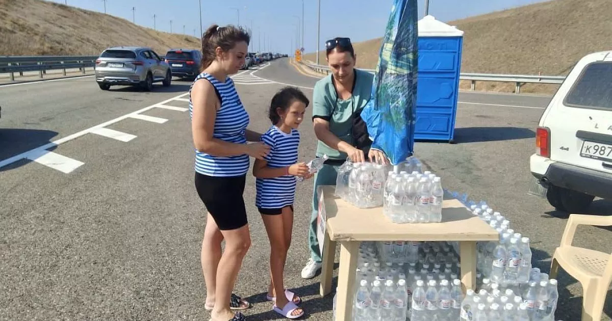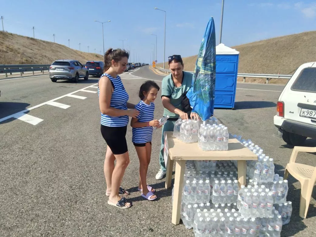 Отмечается, что пункты находятся вдоль трассы на Крым со стороны Тамани. Волонтеры выдают стоящим в пробке водителям и пассажирам бутилированную воду.