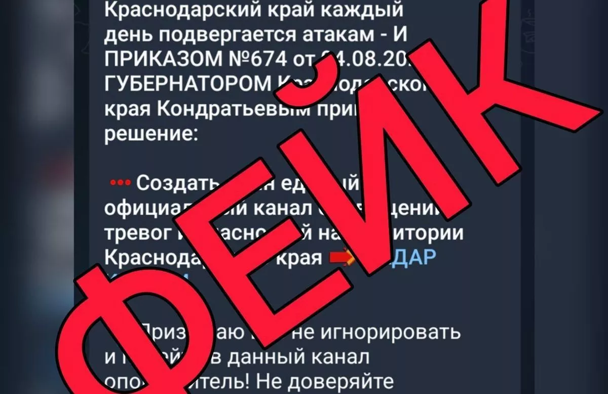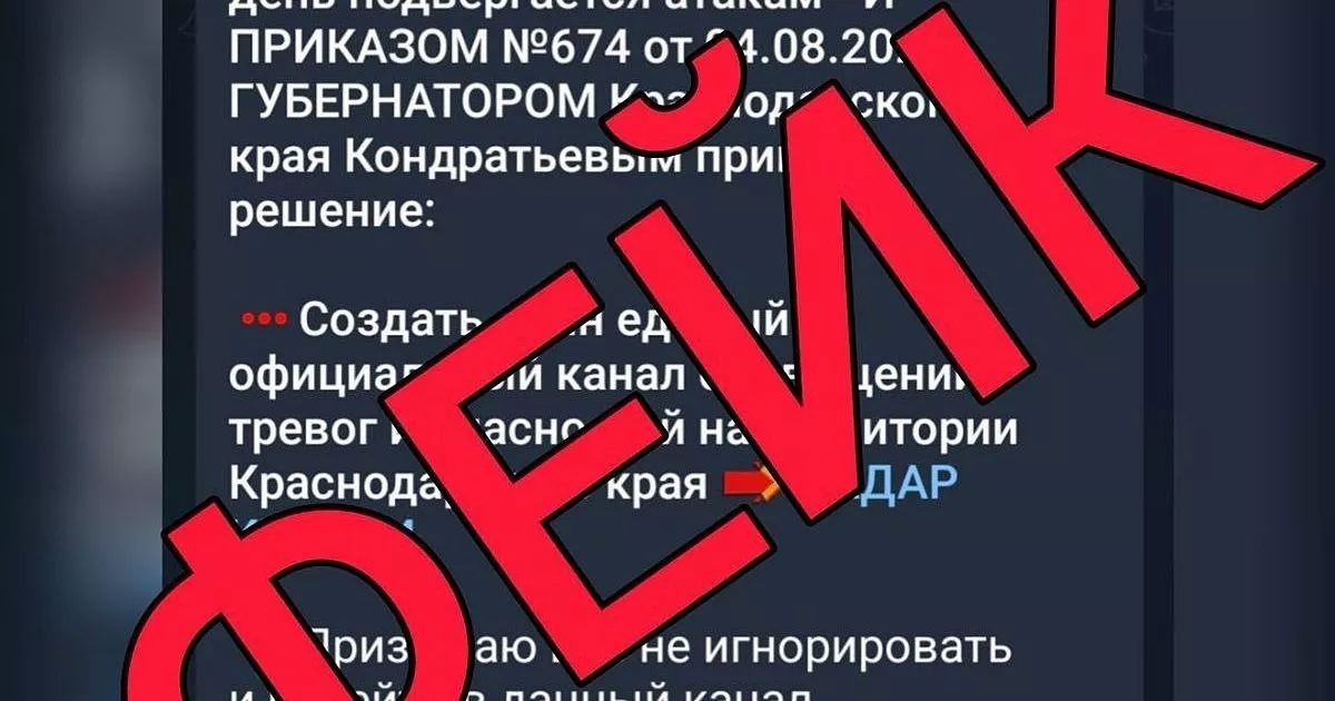 Уточняется, что в фейковых сообщениях ссылаются на «приказ» губернатора Краснодарского края, которого не может существовать. Глава региона, в соответствии с действующим законодательством РФ и Уставом Краснодарского края, может издавать только постановления и распоряжения.