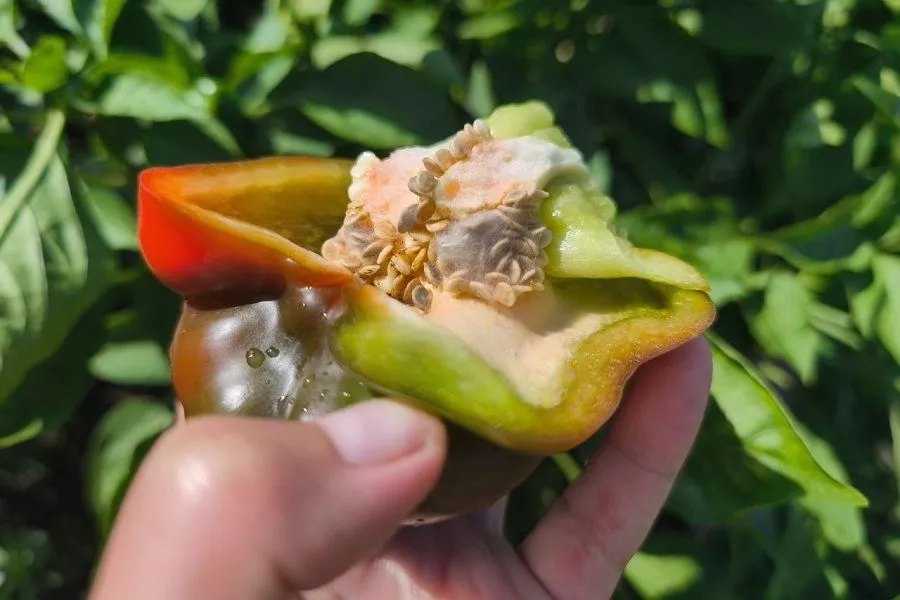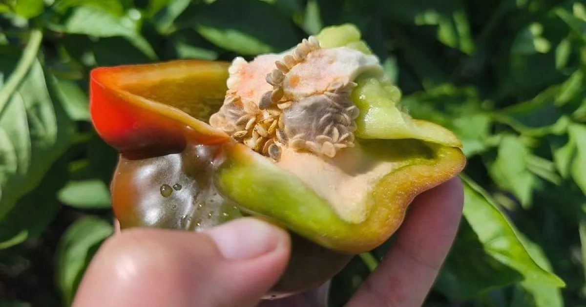 Болгарский перец очень не любит засуху и сразу реагирует на нее сбрасыванием цветов и плодов. Однако к переувлажнению он тоже не лоялен. Чрезмерные поливы, недостаток проветривания теплиц, выращивание перца в слишком густых посадках способствуют повышенной влажности и заселению грибков. Плесень развивается на влажных и плохо проветриваемых участках, в том числе на семенах внутри плода. Механические же, даже незначительные повреждения кожуры делают плод уязвимым для проникновения грибковых спор к семенам и внутренним тканям, что ведет к развитию плесени.