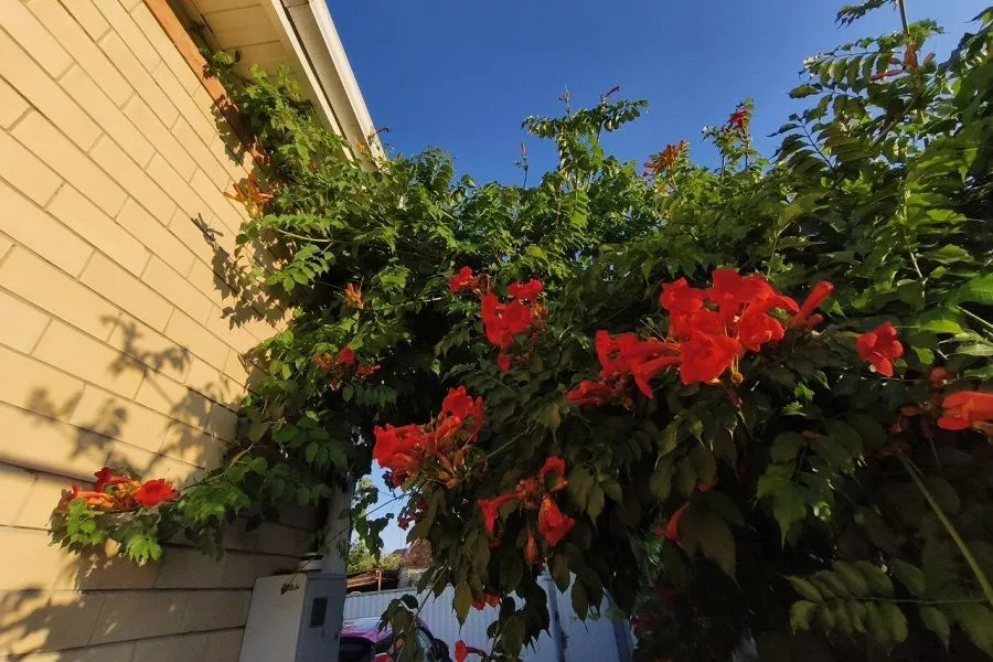 Посадка кампсиса у стен из кирпича или под окнами чревата разрушением строения. Фото: Ксения Мелех
