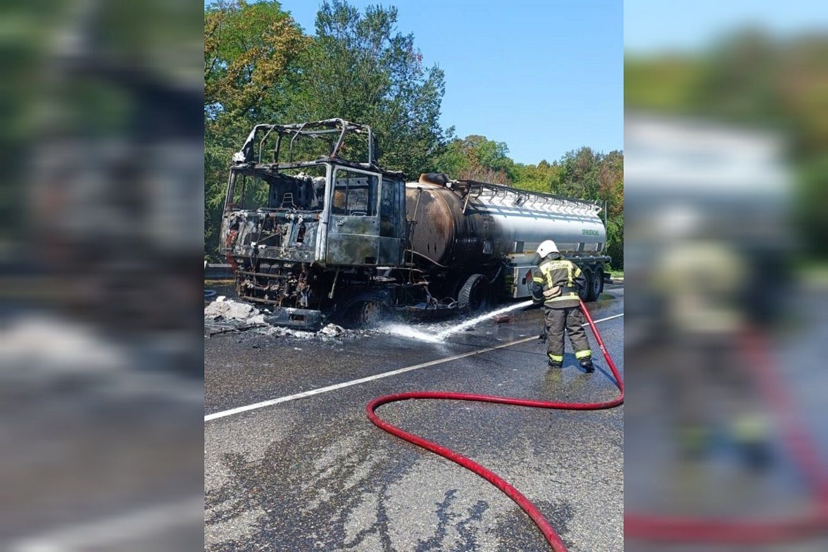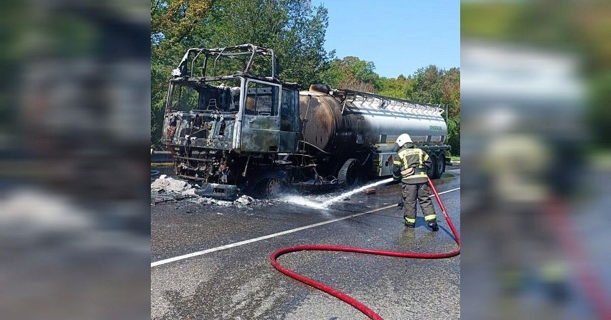 Сегодня на автодороге Джубга - Сочи в районе поселка Калиновка Лазаревского района произошло возгорание грузового автомобиля DAF, перевозившего цистерну с авиационным топливом.